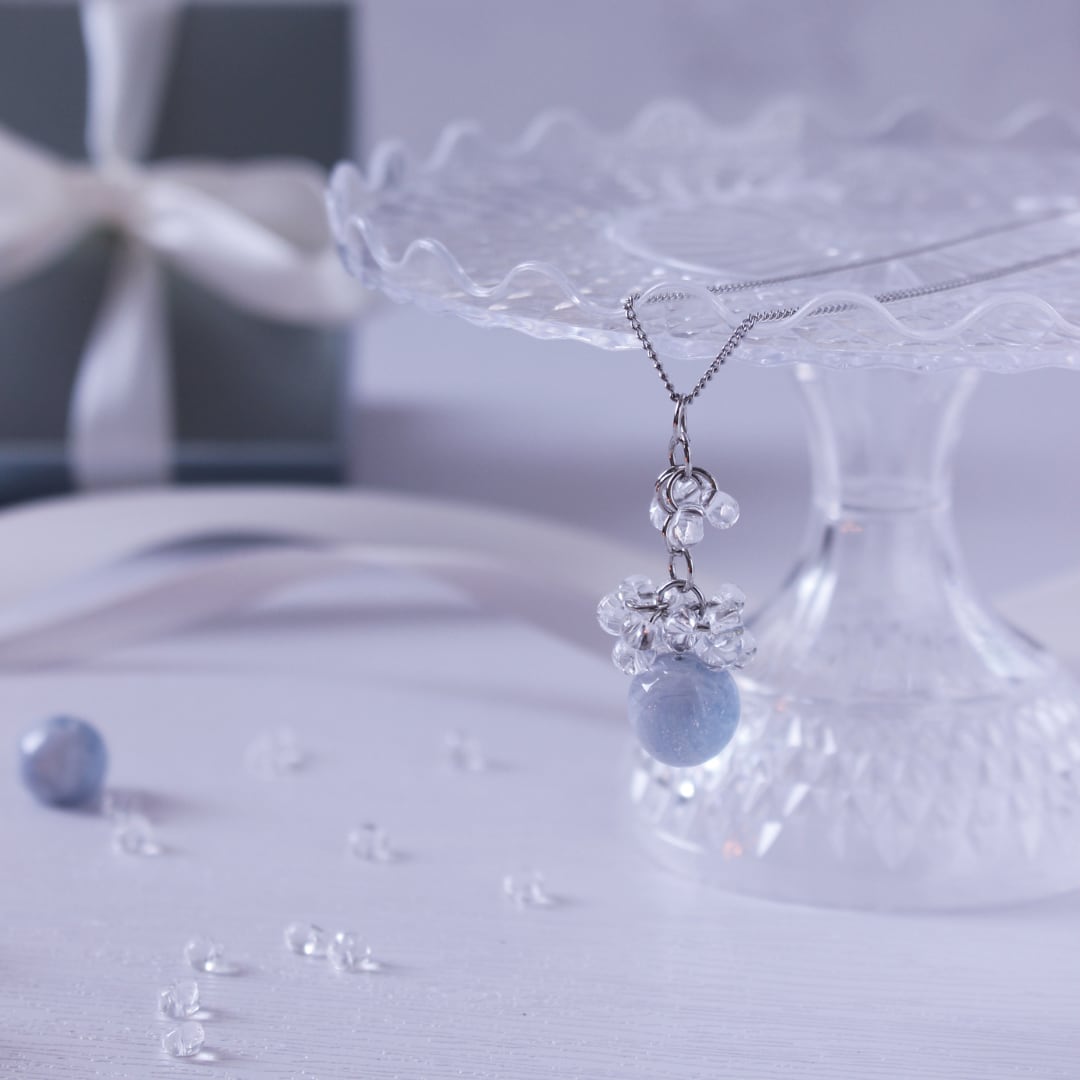 透明感のあるガラスビーズと、天然石のように優しく揺れる丸玉が、